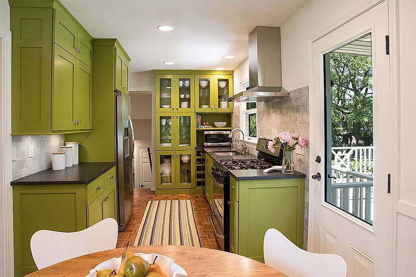Зеленый (дерево). Этот цвет символизирует природу, и потому считается оптимальным для оформления кухонного помещения. Он позитивно влияет на психику, улучшает физические кондиции, расслабляет и успокаивает глаза. Особенно много жизненной энергии ци несет сочетание зеленого и белого, в такой кухне поднимается настроение, формируется атмосфера добра и уюта.