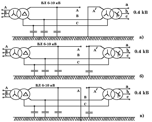 Рис. 2.8. Схемы трех вариантов обрыва проводов, когда потребительский трансформатор 6-10/0,4 кВ оказывается в режиме феррорезонансного преобразователя: а — обрыв фазы А и ее заземление со стороны потребителя; б — обрыв фазы А без заземления провода; в — обрыв фазы А и ее заземление со стороны источника