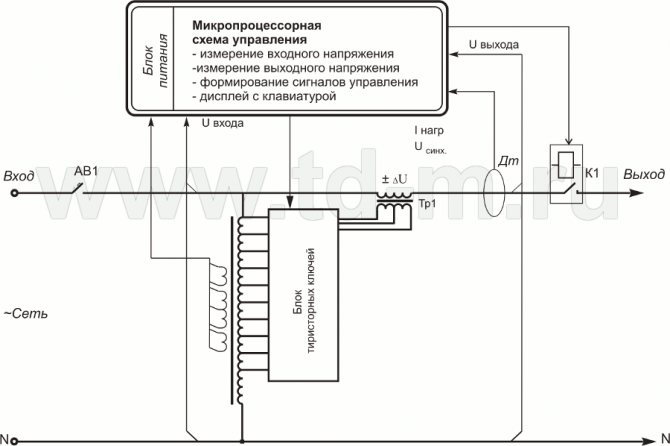 Электронные стабилизаторы напряжения. Наиболее широкий класс устройств ступенчатого регулирования, обеспечивающих исключительное постоянство электропитания нагрузки с заданной точностью в широких пределах изменения входной сети. Принцип работы основан на автоматическом переключении секций автотрансформатора с помощью силовых ключей (реле, тиристоры, симисторы).