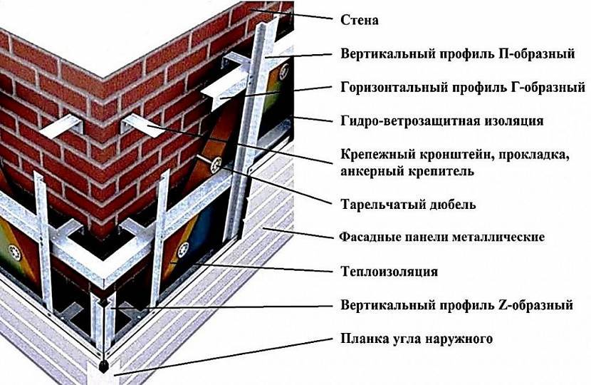 - На этом этапе выполняется монтаж профилей и направляющих. Стальные профили имеют П-образную форму, горизонтальные – Г-образную форму, а в качестве вертикальных промежуточных применяют Z-образные. Их фиксация производится перпендикулярно друг другу, это позволяет придать конструкции нужную жесткость. Для того чтобы закрепить профиль на кронштейны, используют заклепки или саморезы. Как только металлическая подсистема будет установлена, производится монтаж фиброцементных панелей.