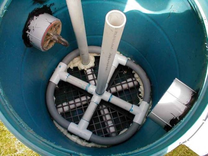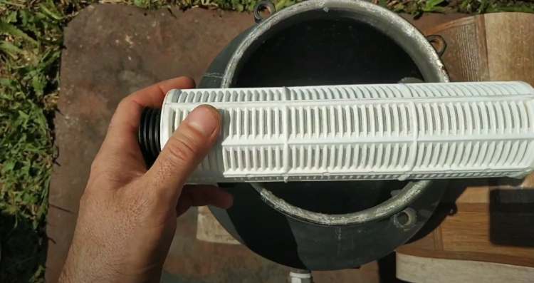 - Подготовьте отверстие для забора воды — это будет перфорированная емкость с установленной сеткой.