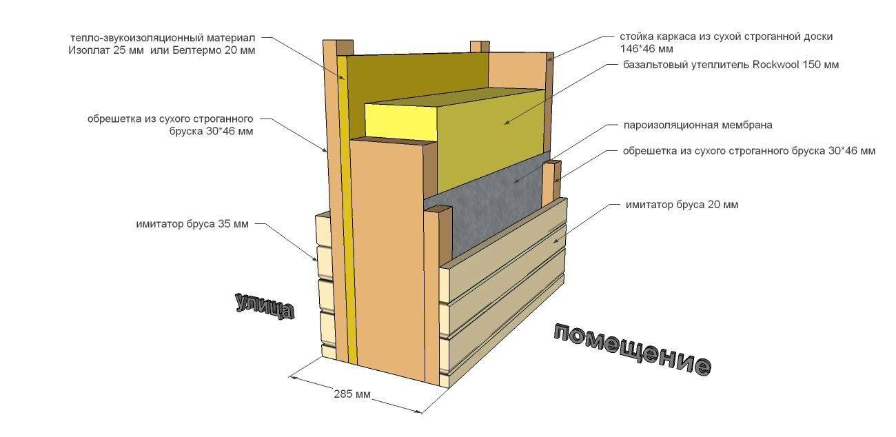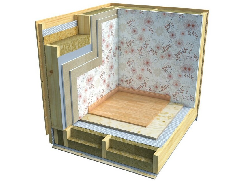 Для теплоизоляции между деревянными плитами стен устанавливают листы гипсокартона и минеральной ваты. При этом щели и зазоры покрывают монтажной пеной, во избежание люфтов и отсутствия сквозняка.