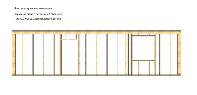 Особенность финского каркаса – установка усиленного горизонтального ригеля в уровне верхней обвязки. Конструкция предназначена для передачи значительной нагрузки на стойки от массивной кровли, которая не имеет промежуточных несущих опор в виде внутренних перегородок.