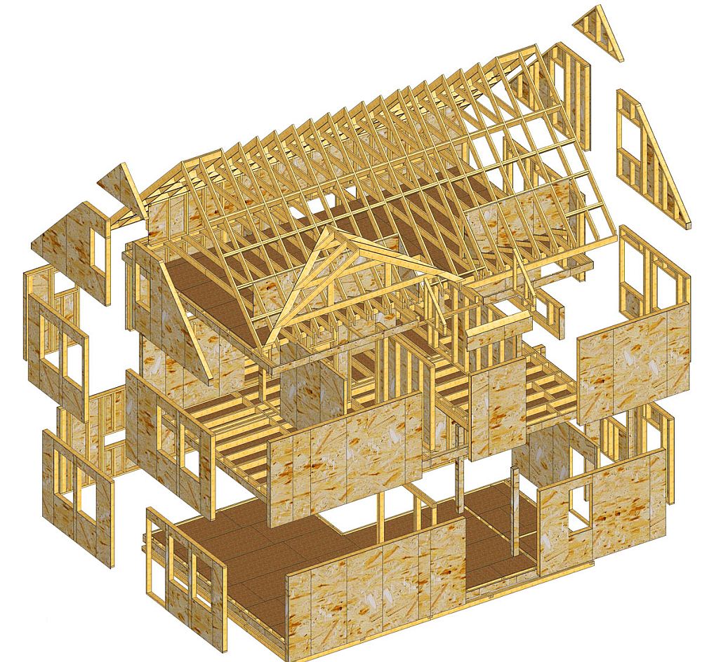 Самонесущая крыша. Конструкция кровли – стропильно-фермовая, что дает свободу во внутренней планировке. Обшивка дома. Для обвязки стен преимущественно используют древесноволокнистые плиты, влагостойкий гипсокартон для фасадных работ. Каркас с ригелями. Для снятия нагрузки с оконных проемов устанавливают вертикальные перемычки. Врезка ригеля позволяет обойтись без оконных хидеров и двойной верхней обвязки, присущей американской технологии.