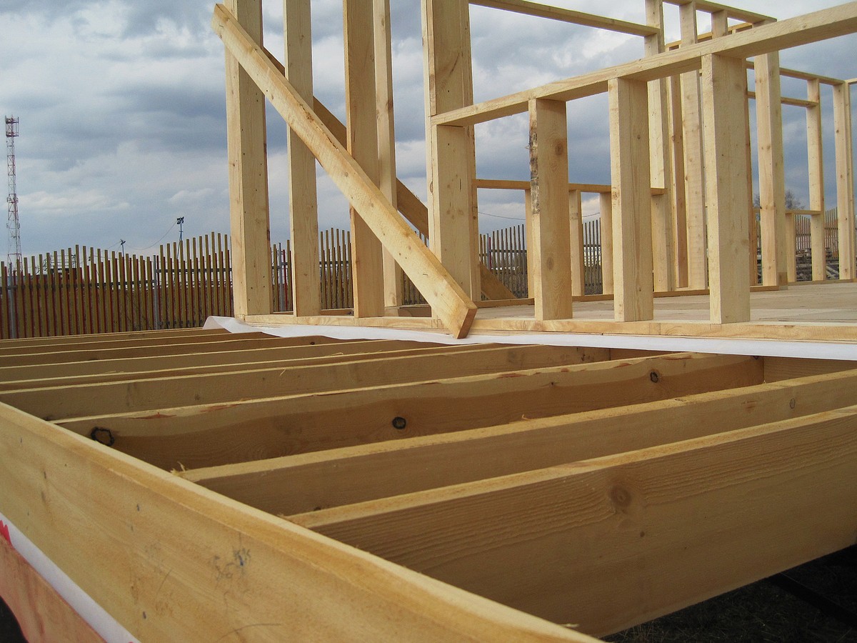 После сооружения каркаса, несущей конструкции, начинается этап создания стен и горизонтальных перекрытий. Черновой пол выкладывают листами ОСБ или фанеры на потолках, после чего он становится первым слоем полового покрытия второго этажа. Поперечный каркас сконструирован, чтобы выдерживать нагрузку и сохранять вентиляционный промежуток, что предотвращает гниение чистовых половых досок при высокой влажности.