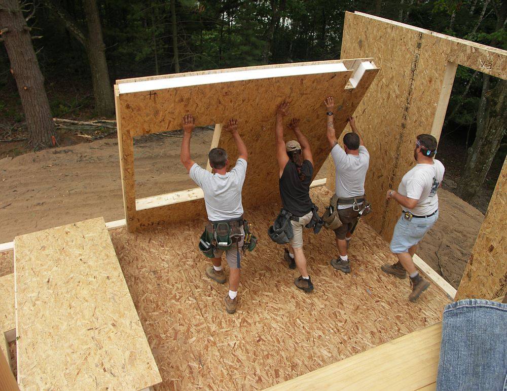 - Мелкопанельные – даже самые крупные части домокомплекта настолько легкие и мелкие, что их можно поднимать и закреплять вручную. Для строительства такого дома достаточно команды из 2-3 человек.