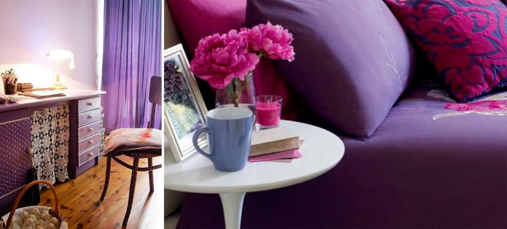 Поскольку аметистовый цвет состоит из двух основных — красного и синего, то применять его следует с осторожностью. Стоит выбирать обои и мебель, исходя из конкретных условий и параметров комнаты