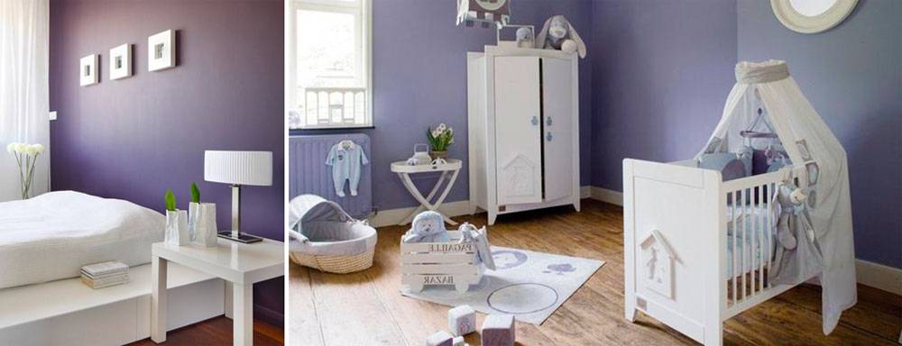 Например, одна сторона комнаты пусть будет лиловой, а противоположная — более светлой. Это поможет зрительно расширить пространство или сделать акцент на какой-либо части помещения.