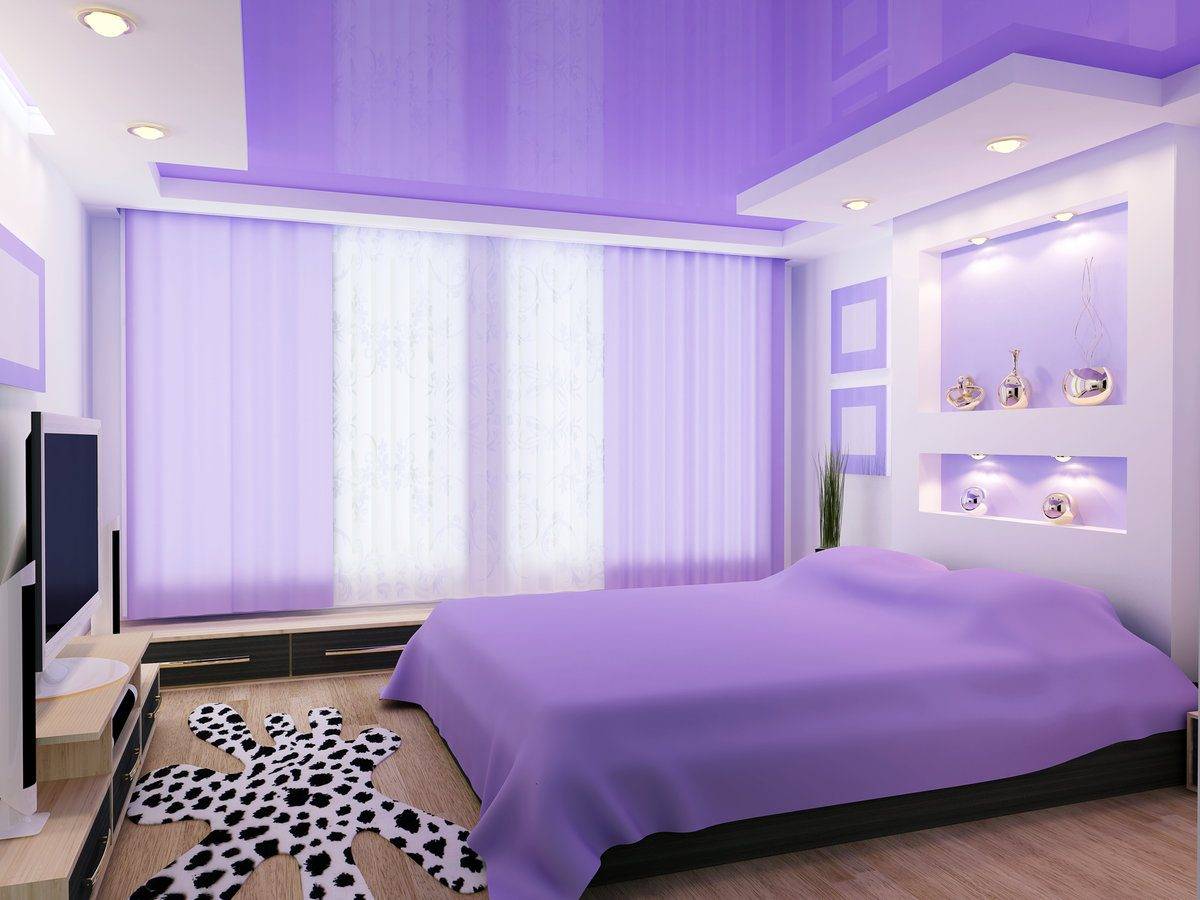При осмотре помещения внимание, прежде всего, обращается на потолок и стены. В случае с лавандовой спальней хорошим решением будет окрасить стены по-разному