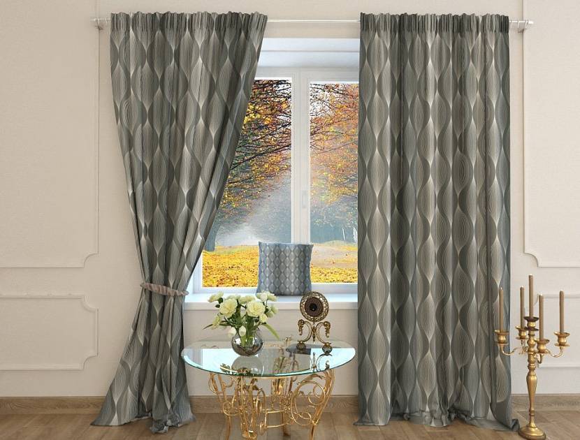 Серые занавески с графикой. Это может быть любой узор: строгая клетка из узкой полоски или же оформление дизайна шахматной доски. Узор может состоять из волн и зигзагов