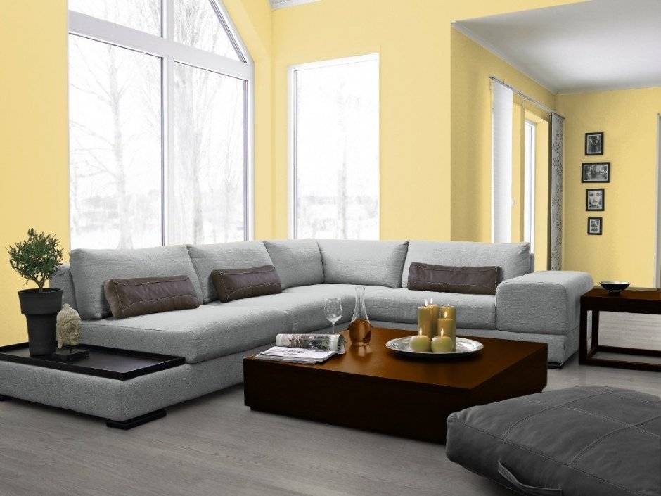 | Яркая гостиная | В ярком дизайне с использованием насыщенных цветов отлично будет смотреться темно-серый диван из замшевой обивки или эко-кожи. | 1. Лучше подбирать желтые или синие контрастные цвета. 2. Красный цвет стен будет действовать утомляюще. |