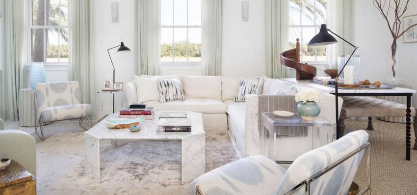 Подбирая мягкую светлую мебель для гостиной, оформленной в светлых тонах, убедитесь, что она не будет сливаться со стенами. Оптимальной считается разница в несколько оттенков. Удачным сочетанием будет белоснежный диван и песочные обои или алебастровые стены и кушетка цвета карамели.