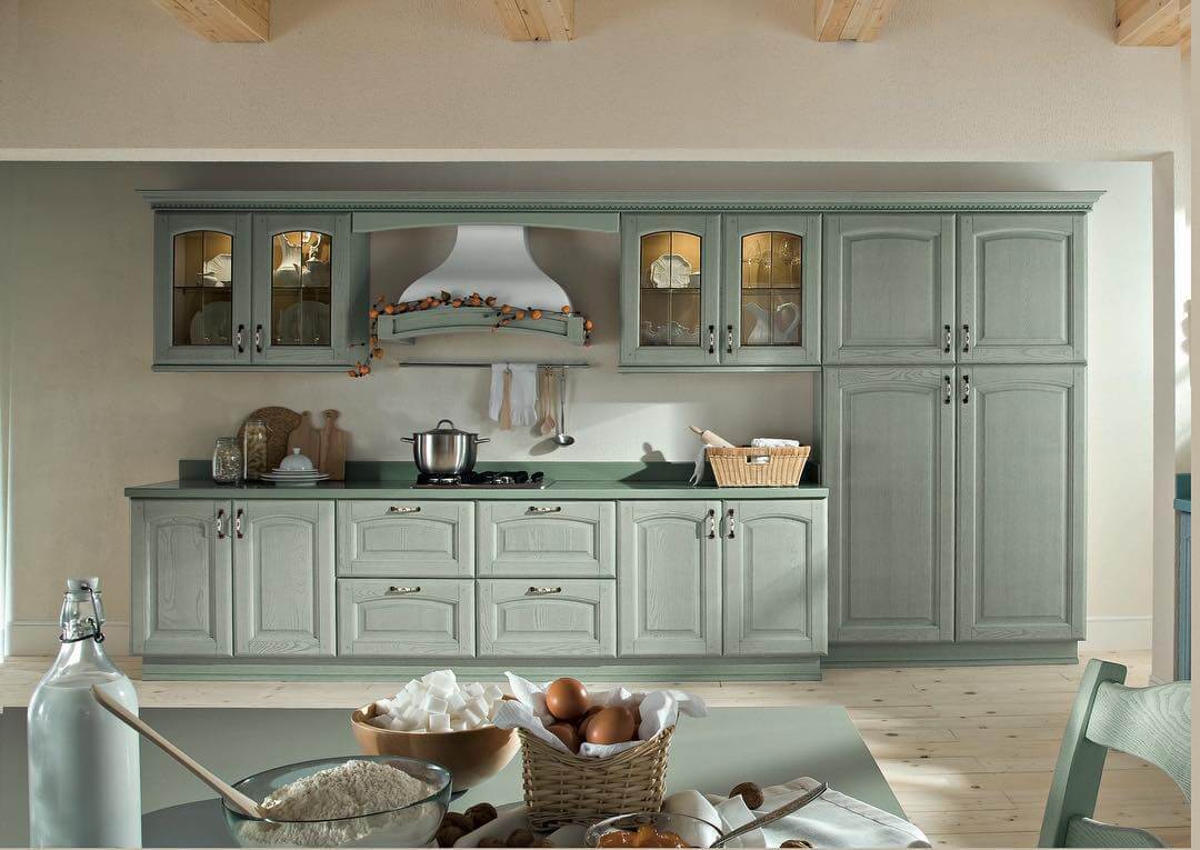 Дизайн кухни в стиле кантри, прованс либо классика нельзя представить без фисташкового. Он очень хорошо выглядит в сочетании с деревянной мебелью, естественными материалами и светлым текстилем, улучшает аппетит.