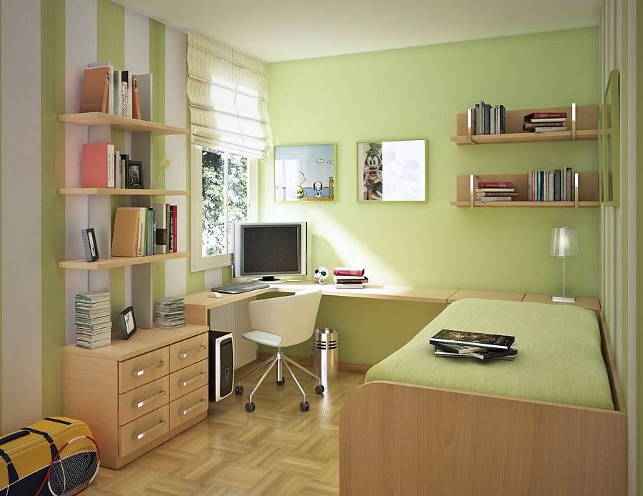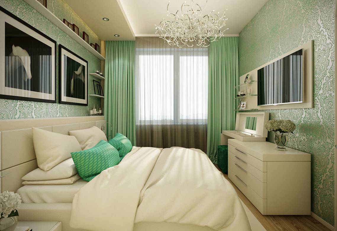 - Стены небольших комнат с малой освещенностью не стоит выполнять в темных цветах. Можно сделать акцент с оттенком фисташки на одной стороне, а с противоположной стены – украсить окно светлыми шторами.
