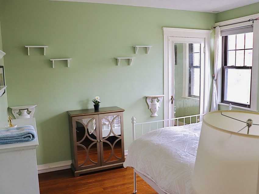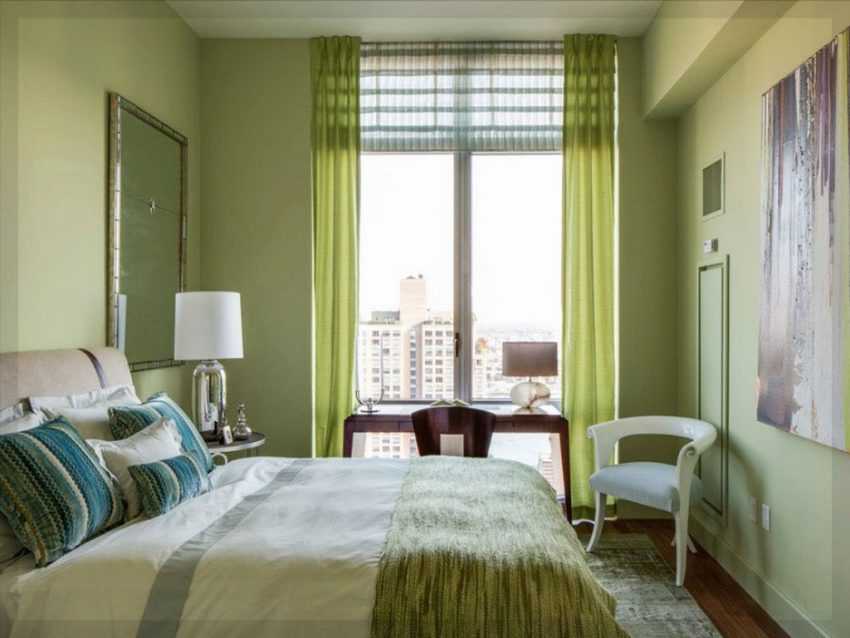 Сочетая насыщенный и глубокий фисташковый цвет с белым, создают естественную и спокойную обстановку в спальне. За счет белого комната визуально преображается, приобретая простор и свежесть.