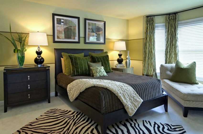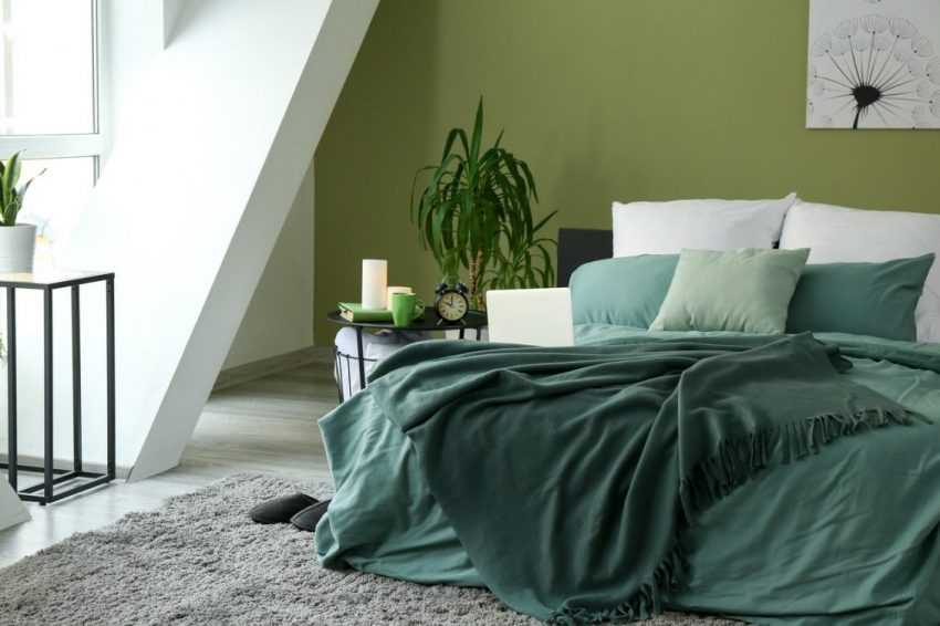 Оливковый цвет способствует релаксации, подсознательно проводится аналогия с природной зеленью. Использование этого оттенка в спальне будет удачным решением.