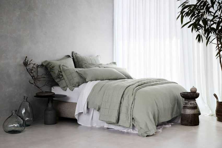 На фото спальня с серыми стенами, зеленые предметы интерьера выступают в качестве дополнительных оттенков.