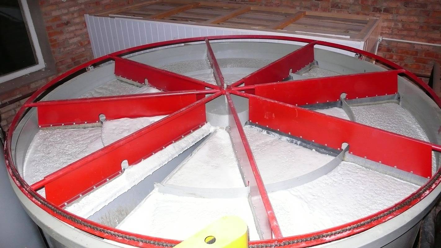 - Перемешивание производится в резервуаре, который оснащён специальными колёсами с лопастями.