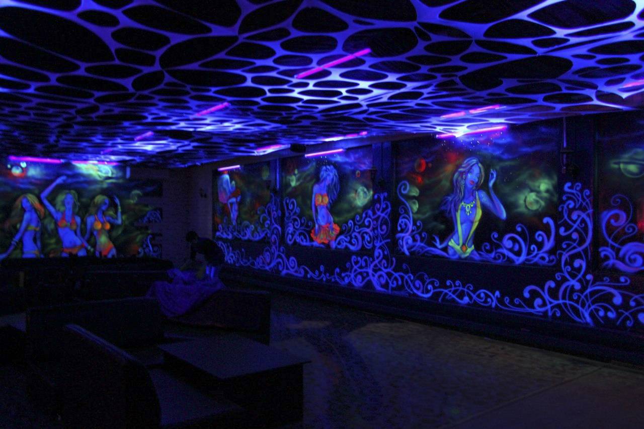 Очень часто роспись используется для украшения общественных помещений: рестораны, клубы и другие увеселительные заведения. Именно в таких заведениях флуоресцентные краски создают светящуюся атмосферу. Особенно оригинально смотрятся красные флуоресцентные краски.