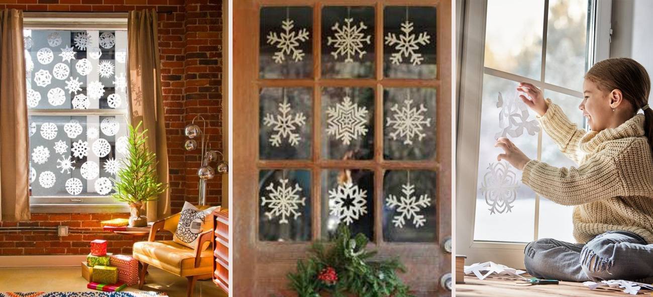 Для украшения окон и дверей не нужно изобретать велосипед. Старый, проверенный временем способ срабатывает на «ура». Тематические картинки и снежинки, вырезанные по трафарету из обычной бумаги, приклеенные на мыло, сразу поднимут настроение.
