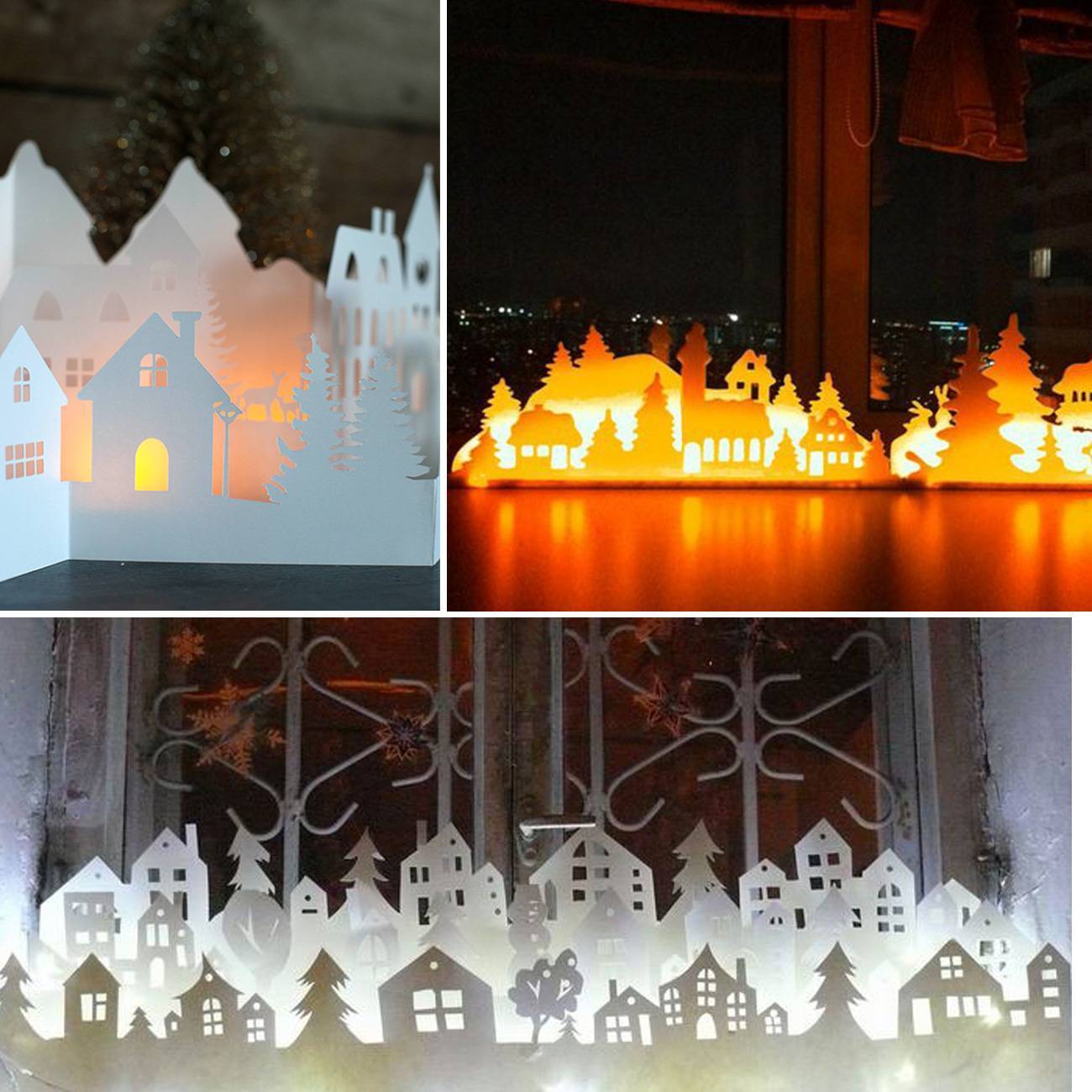 Очень красиво можно оформить подоконник с помощью бумаги и подсветки. Конечно, для подсветки лучше не использовать открытый огонь. Такую бумажную зимнюю композицию можно поставить также на стол или любое другое место в доме.