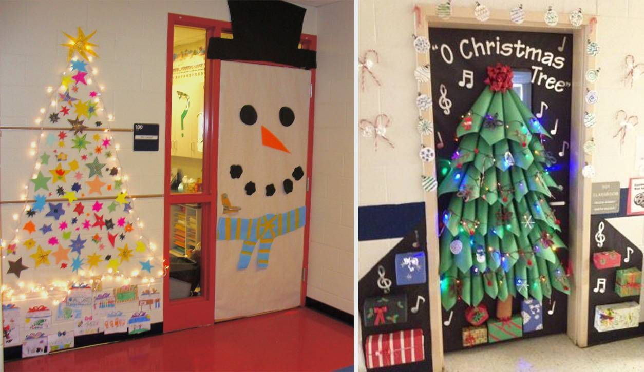 Главный вход или дверь в кабинет декорируют поделками в виде рождественского венка или новогодней ёлки.