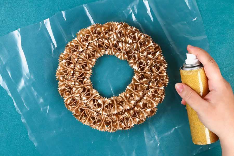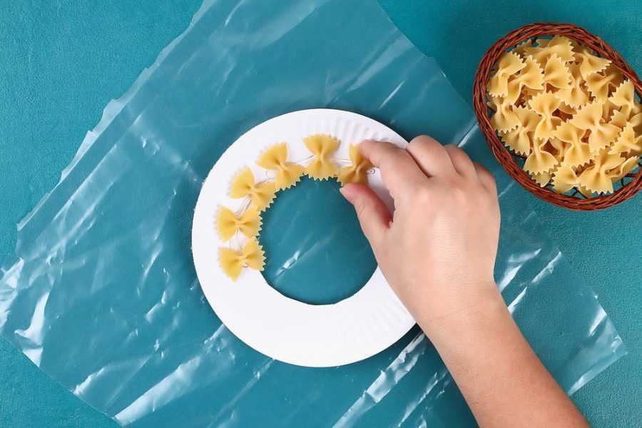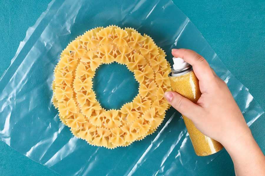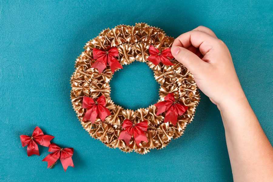 Если запланирован узор или орнамент, то покрытые клеем участки посыпаются зёрнышками, края элементов подравниваются зубочисткой или кисточкой. В качестве дополнительного декора можно использовать мелкие шаблоны поделок из круп (звездочки, оклеенные пшеном, ёлочки, выложенные гороховой мозаикой, колокольчики, посыпанные кукурузной крупой, и т.п.), шишки, шарики, бантики и т.д. По окончании работы Рождественский венок подвешивается на льняную полоску или ленту.