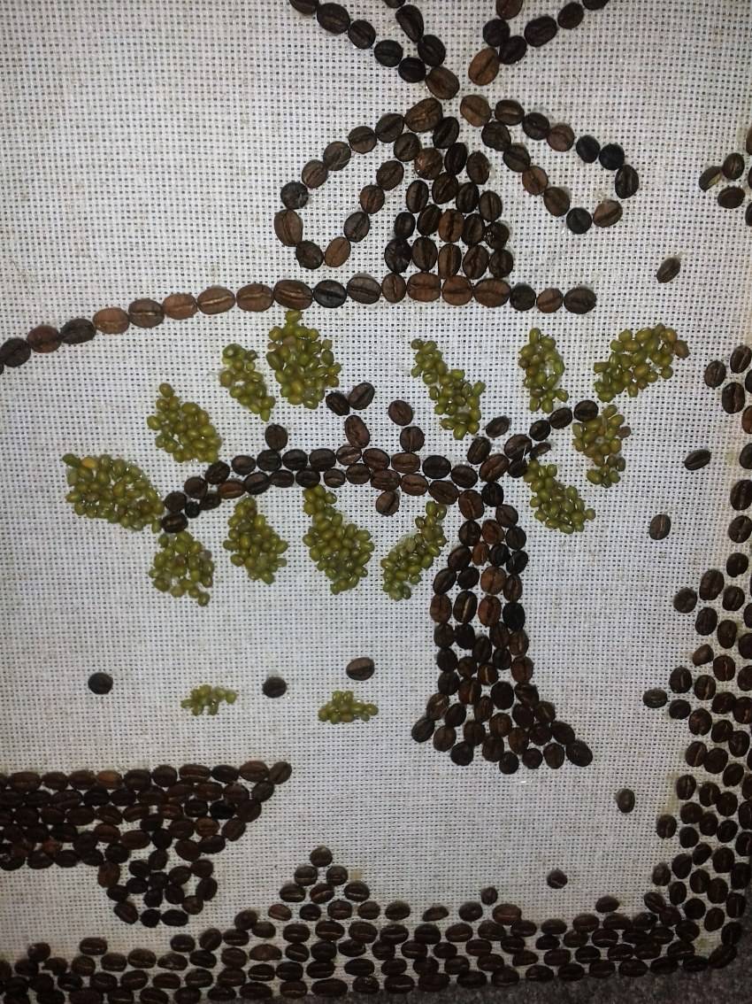 Для оформления можно использовать колотый горох, фасоль, чечевицу, кофейные зёрна и другие семена и крупы – в зависимости от художественного замысла. Фиксировать их на основе можно с помощью термо- , силиконового клея или ПВА с учетом особенностей взаимодействия материалов.