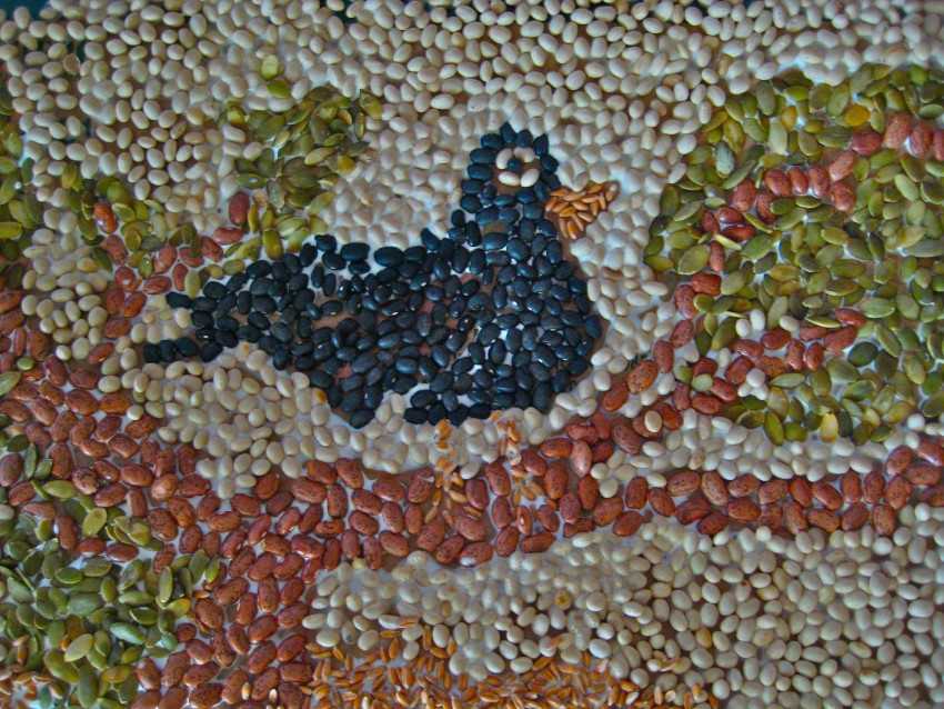 Поделки из крупы и семян — это и панно, и аппликации, и элементы декора, и кормушки для птиц. Смотрите, как сделать топиарий, венок из гороха, ёлку из семечек.