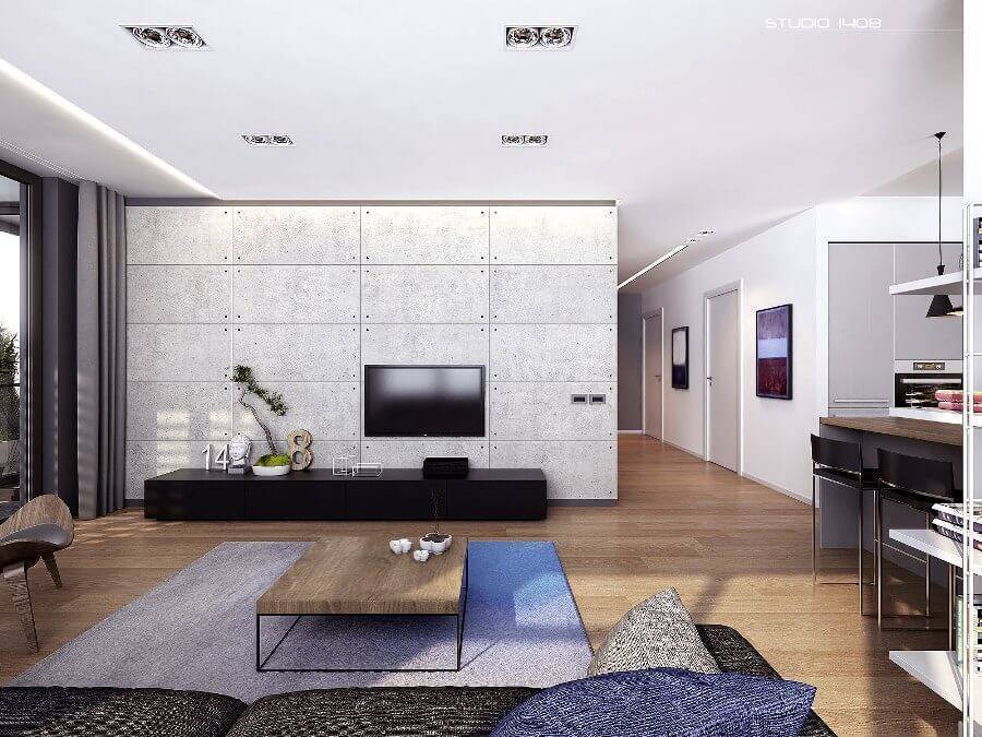 Интерьер квартиры в стиле минимализм потребует снести перегородки. Если внутренние стены полностью снести нельзя, делают арки и подпорные колонны. Помещение зонируется с помощью многоуровневого потолка и нескольких типов освещения.
