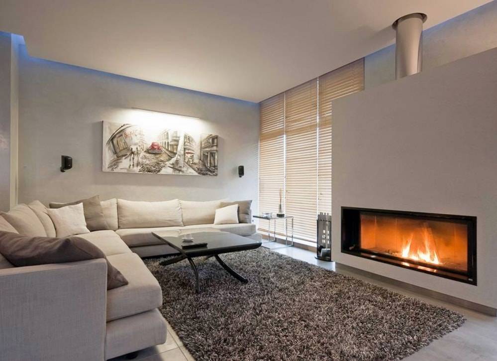 В дизайне главной комнаты дома должны быть продуманы все нюансы. Увеличить пространство получится с помощью больших окон. Используют встроенную мебель, на стену вешают телевизор. Диван, кресла и столик должны иметь строгие очертания и силуэты без изгибов.