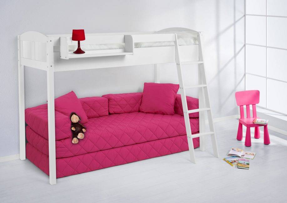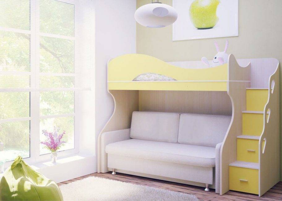 Трансформер, превращающийся из дивана в двухэтажную кровать – редкий вариант. У таких моделей нет места для хранения вещей, но это удобно для дачи или квартиры бабушки с дедушкой, куда дети приезжают на каникулы. Если у разнополых детей общее игровое и учебное пространство, мебель должна быть светлой, нейтрального дизайна.