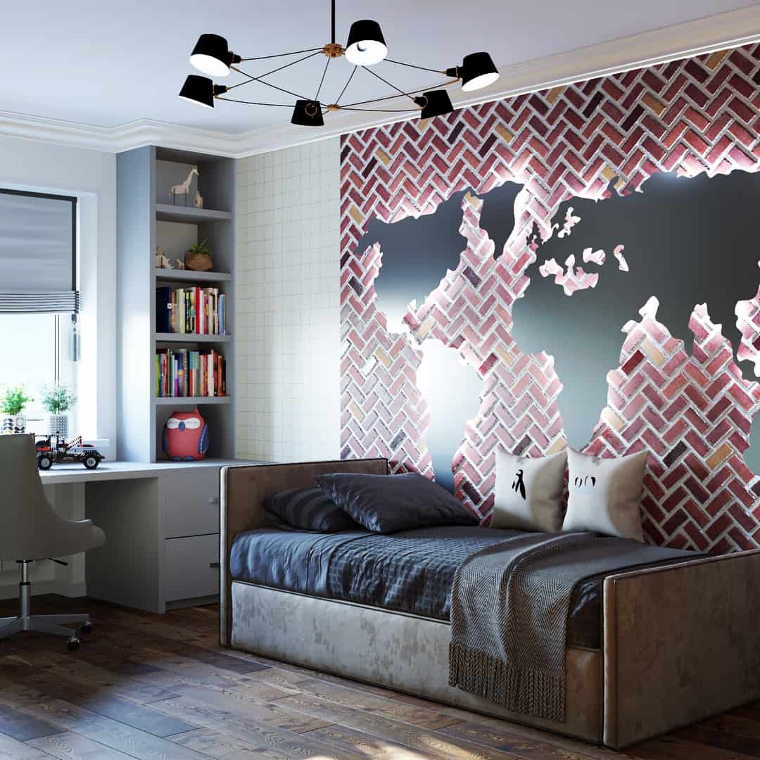 Сочетание фотообоев с тематикой города и фактуры под кирпич. Решение для оформления пространства двух братьев с акцентированием зоны спальни.