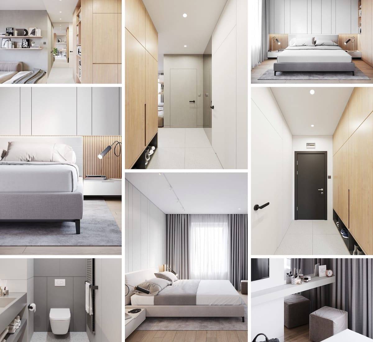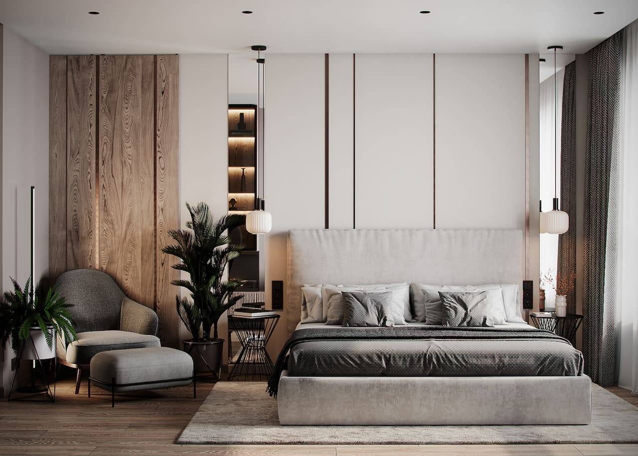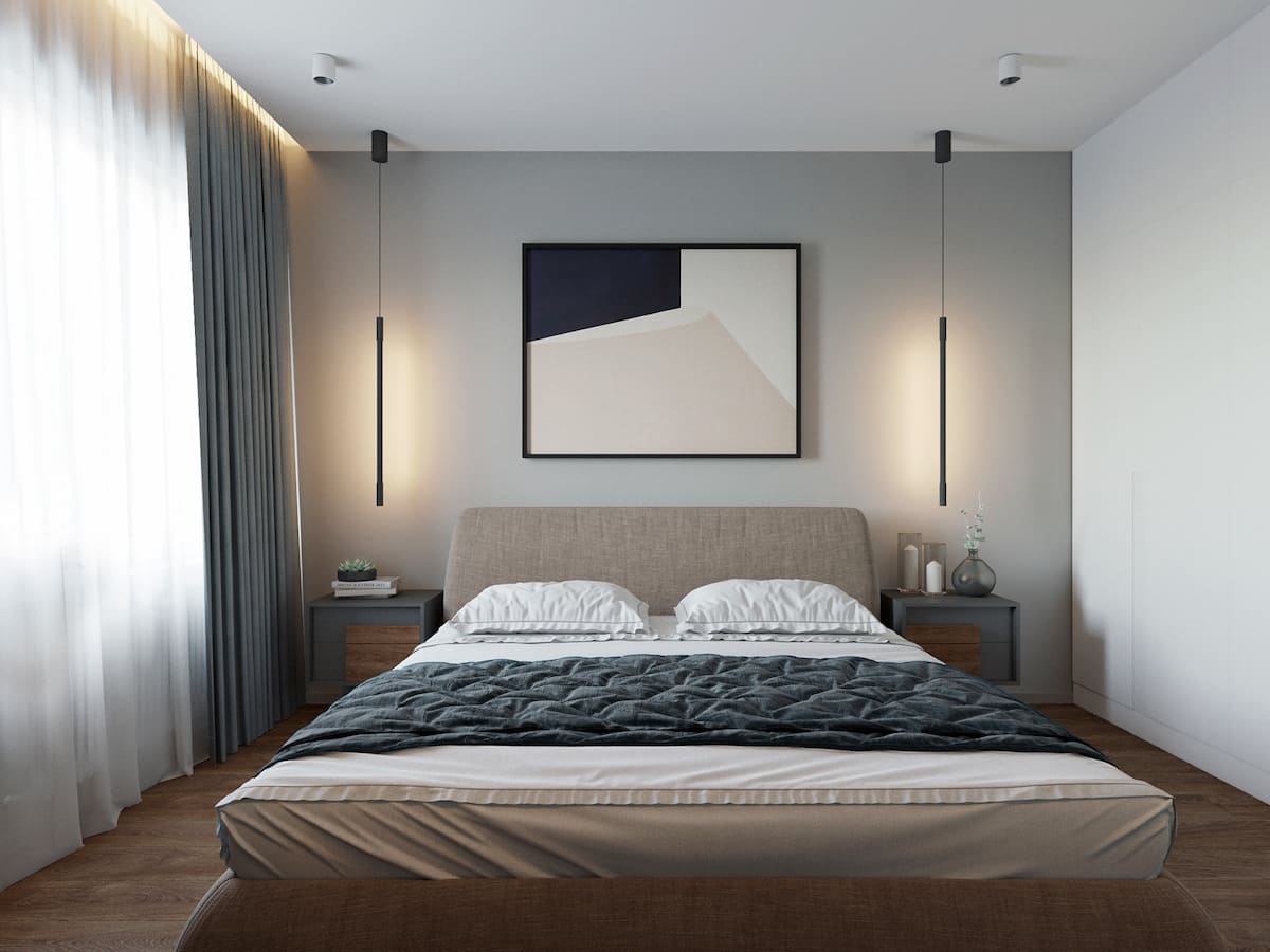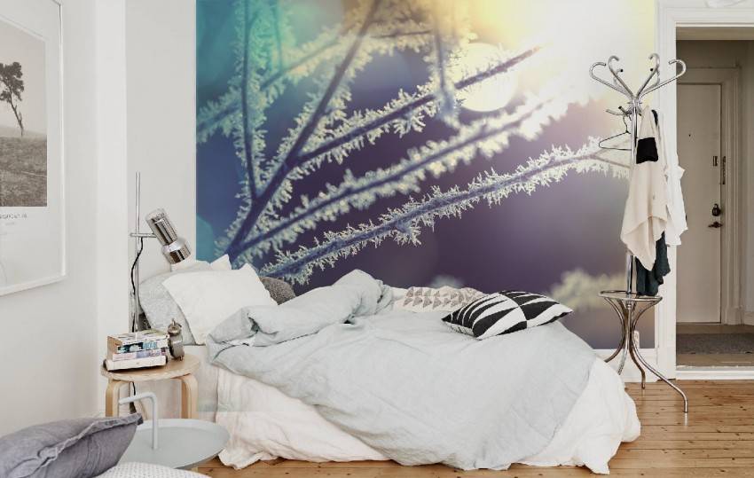 Фотообои в холодной гамме в спальне скандинавского стиля