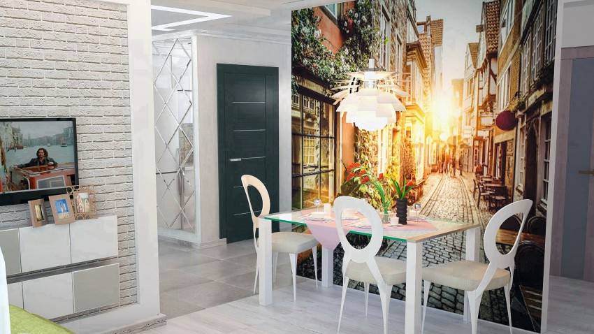 - Оптимальным вариантом для ремонта в условиях небольшой площади, например в хрущевке станет отделка одной из стен фотообоями светлого оттенка.