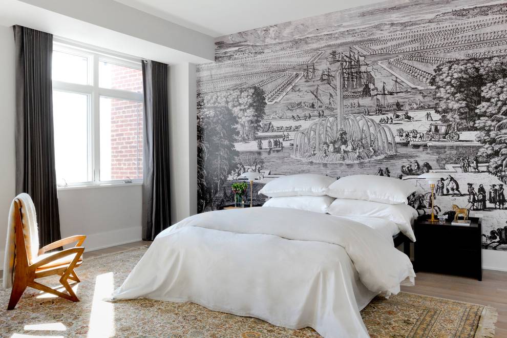 Для спальни отлично подойдут полотна с рисунком, изображающим природу и панорамные фотообои, а расположение их возле выхода способно зрительно увеличить помещение. Не стоит злоупотреблять контрастом, в противном случае они не позволят чувствовать себя в помещении гармонично.