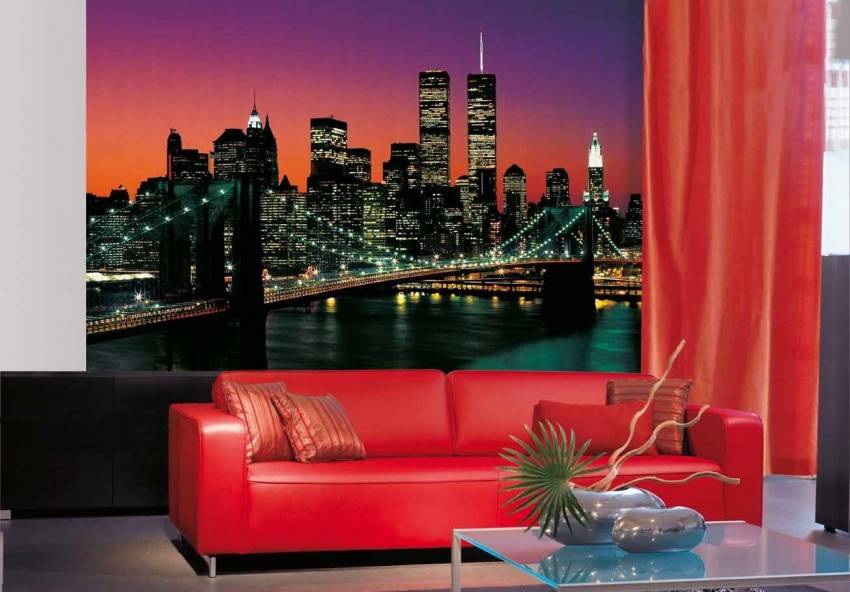Фотообои в зал — идеальные вариант. В комнате для приема гостей хорошо смотрятся рисунки изображением больших городов и достопримечательностей. Создается впечатление того, что помещение является их продолжительностью.