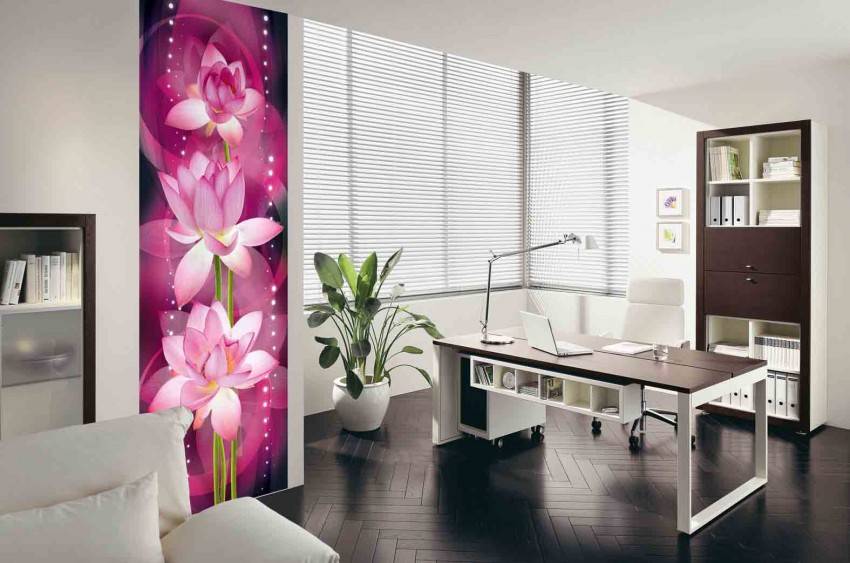 - Глухое изображение, например цветы или абстракция уменьшают комнату за счет объемного рисунка.
