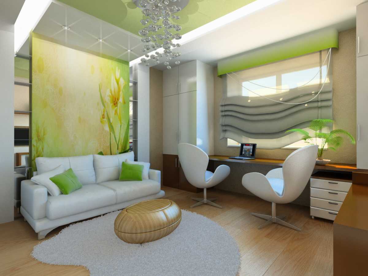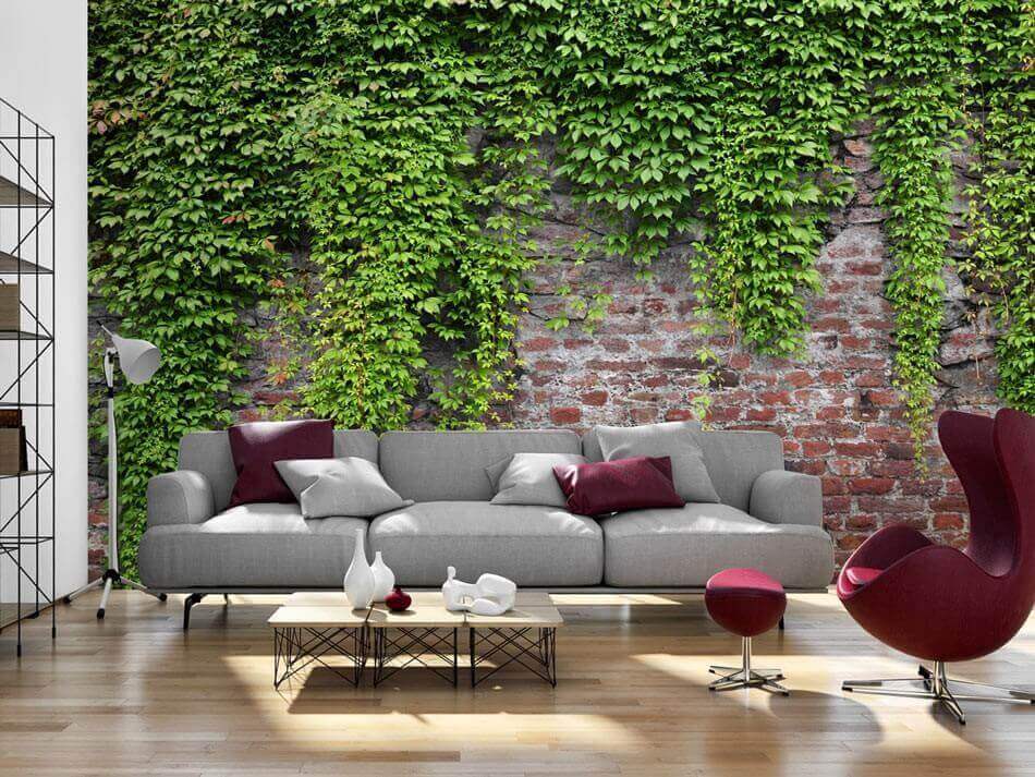 Рекомендации комбинирования обоев с основным зеленым цветом и фоновыми материалами бежевого или белого оттенков помогут создать успокаивающий эффект. При этом стоит учитывать, что подобранный фон в тон основному мотиву на фотообоях может заглушить сам рисунок и свести на нет весь эффект.