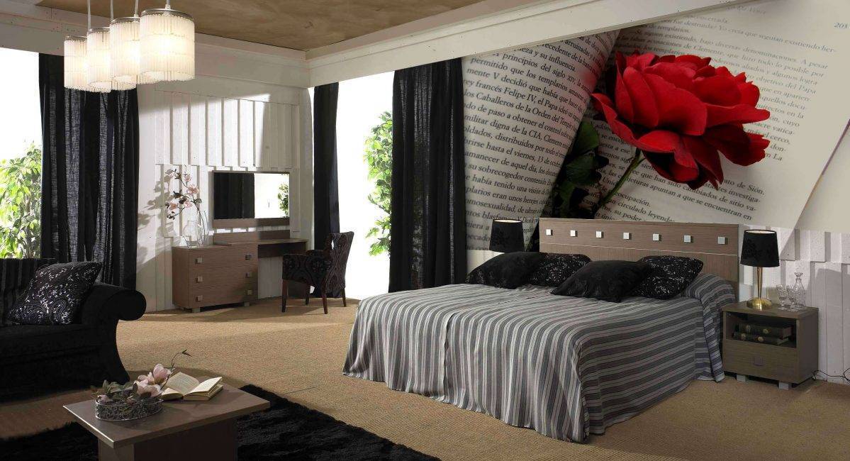 Один из самых любимых, романтичных и красивых вариантов оформления спальной комнаты. Цветы гармонично смотрятся в интерьере выдержанном классическом и в современном стиле. Это могут быть роскошные розы, королевские лилии, скромные ромашки, экзотические орхидеи и великолепные пионы. Особенной популярностью пользуется цветочная макросъемка, однако такой вариант приемлем лишь для просторных помещений.