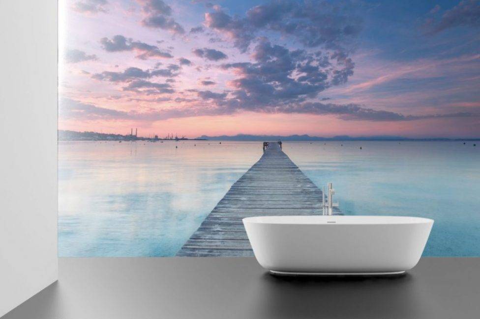 Морская тематика – не единственная, которая доступна к воплощению в ванной комнате. Оригинально будет смотреться лесной пейзаж, горы, водопады, создающие ощущение простора и чистого воздуха.