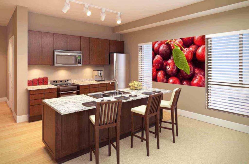 Если кухня с гостиной объединены в одно помещение, надо правильно обозначить границы пространства. Для этого прекрасно подходят фотообои, надо лишь подобрать вариант подходящего размера.