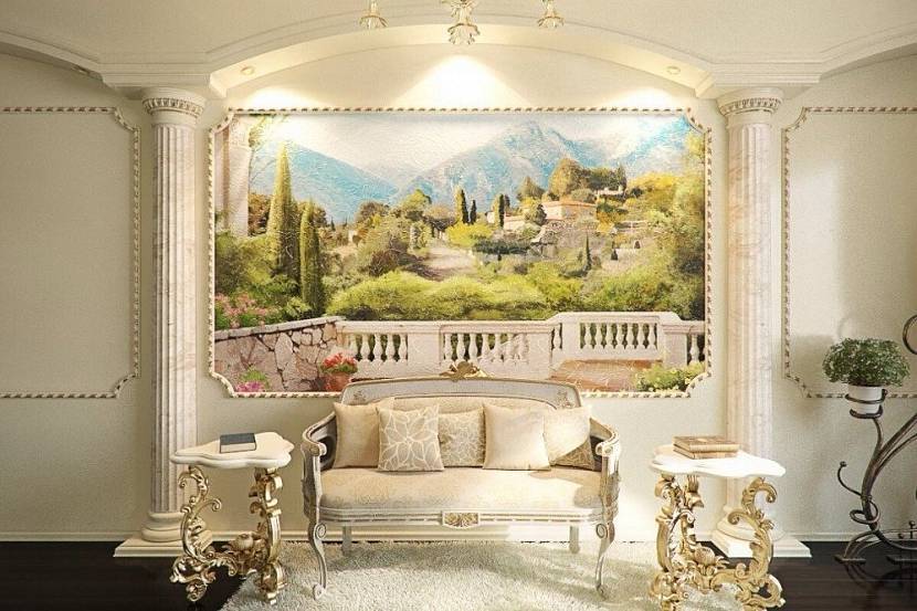 Главным местом крепления такого полотна остается свободная стена, на которой и будет акцентироваться внимание в интерьере. Многие прибегают к варианту обрамления боковых швов с помощью лепнины, красивого багета, молдинга