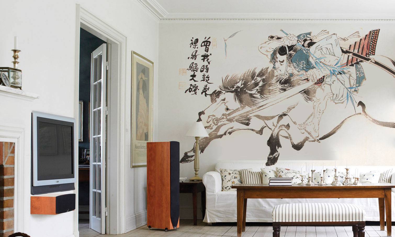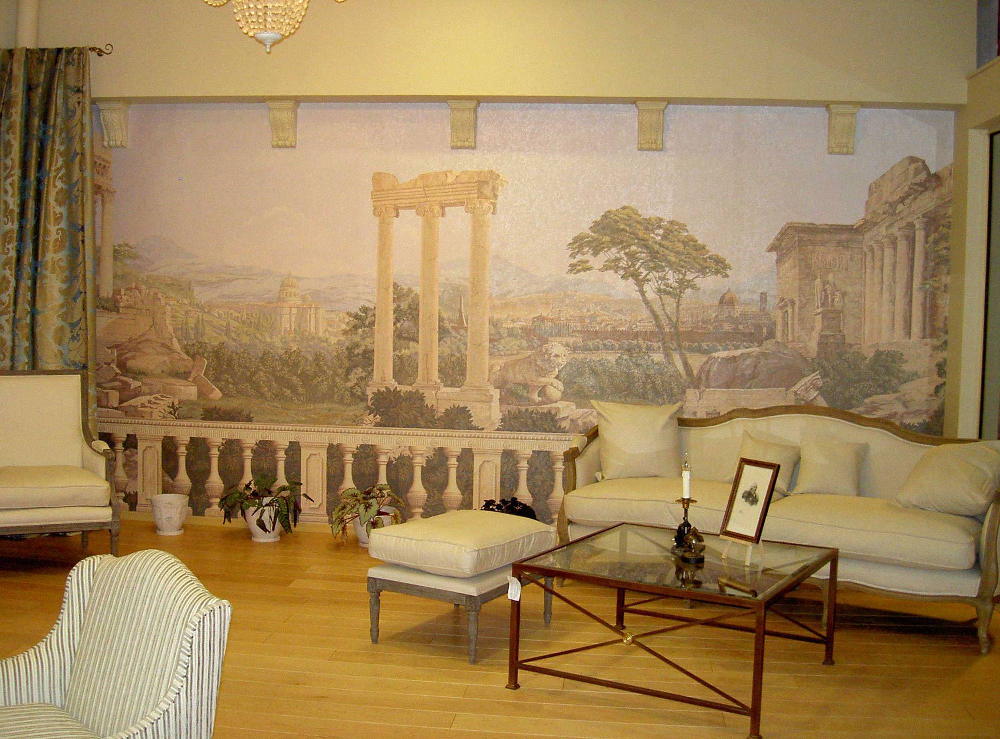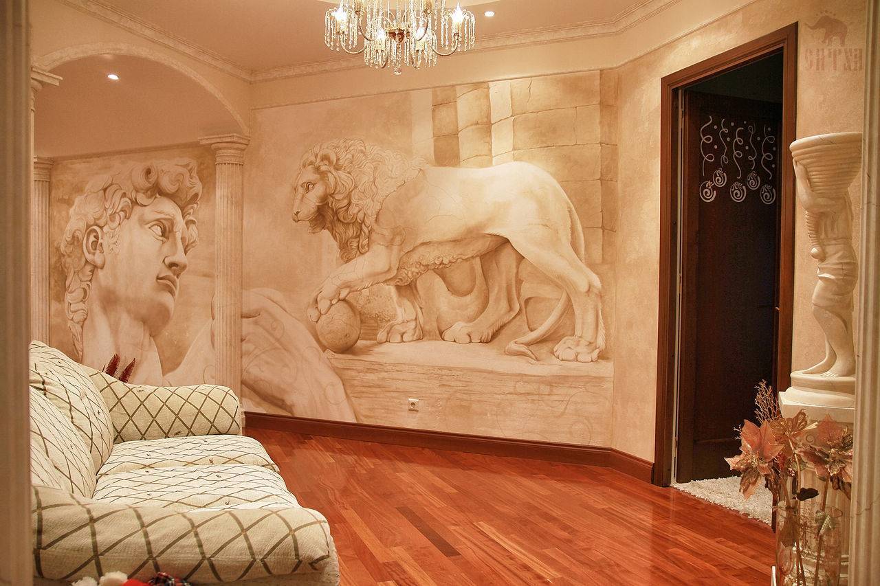 Это комната, где собираются вместе все члены семьи, располагаются гости. Фреска на стену в зал должна соответствовать его стилю. Есть много вариантов сюжетов для украшения этого помещения: