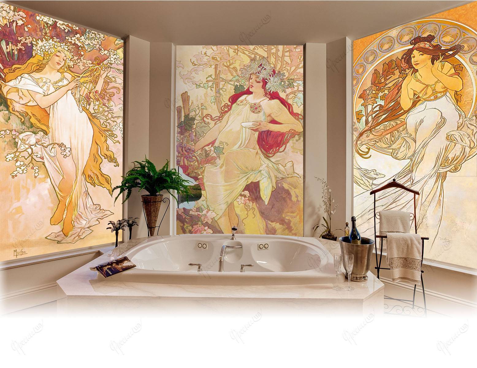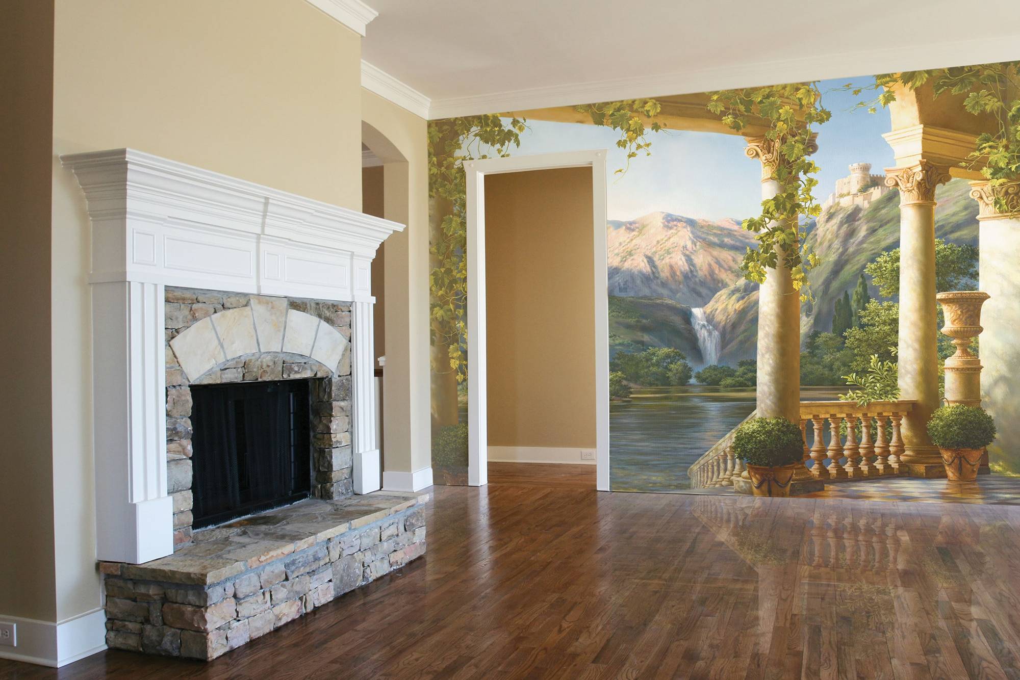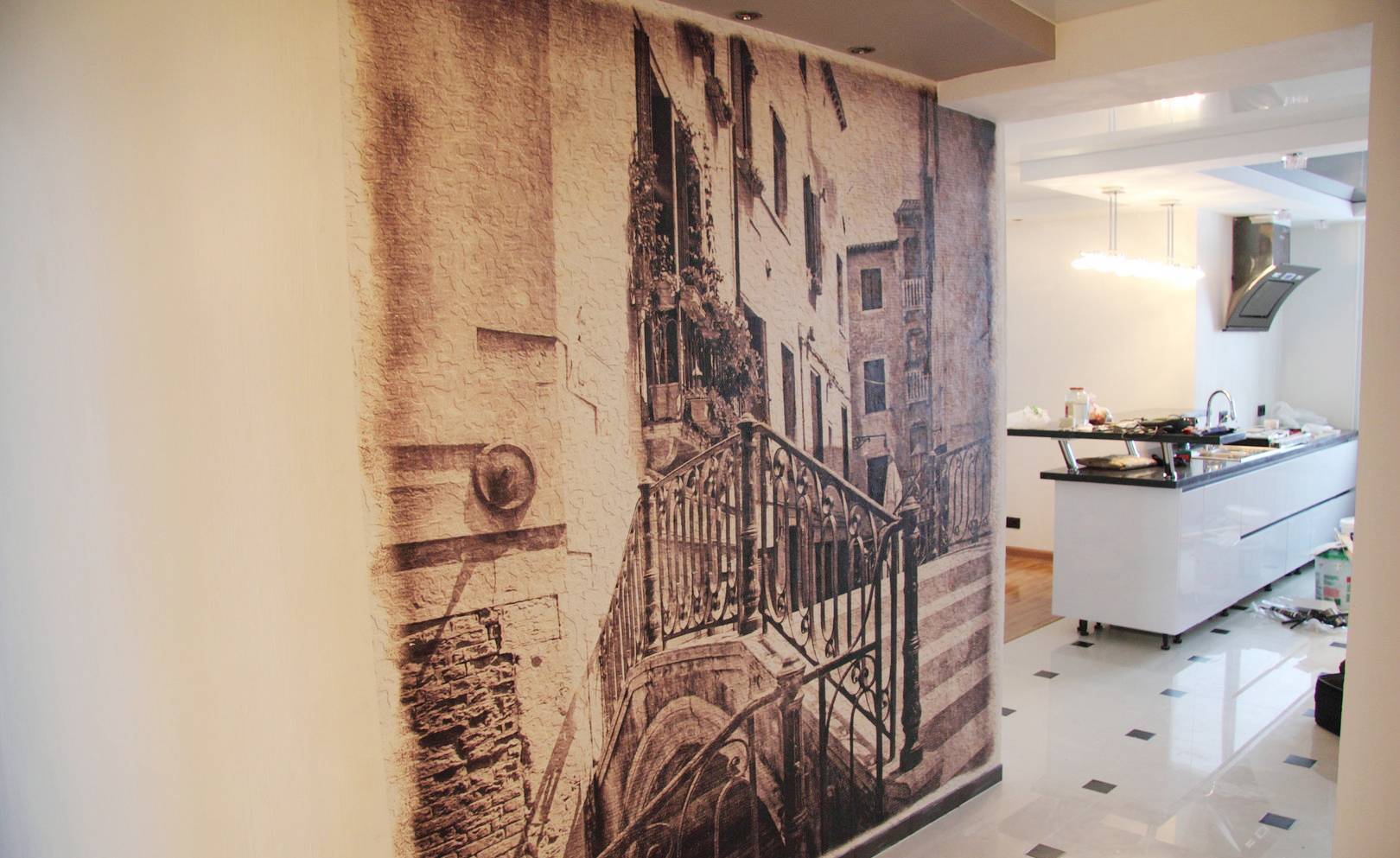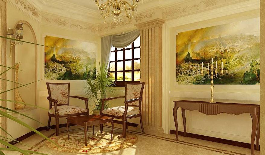 - для украшения различных архитектурных деталей, например, ниш, выступов, колонн. При правильном подборе изображения можно добиться невероятных эффектов. Например, при изображении в нише распахнутых дверей балкона с видом на море можно создать ощущение, что квартира, в самом деле, расположена на берегу.