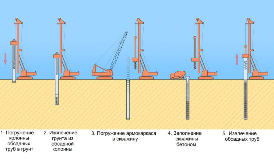Для буронабивных свай, в грунте высверливают буром отверстия, в которые помещают обсадные трубы. В них устанавливают каркасы, после чего полости заливают бетоном. Устройство буронабивных конструкций является более выгодным с материальной точки зрения по сравнению с установкой винтовых свай. Разница может составлять до 30%.