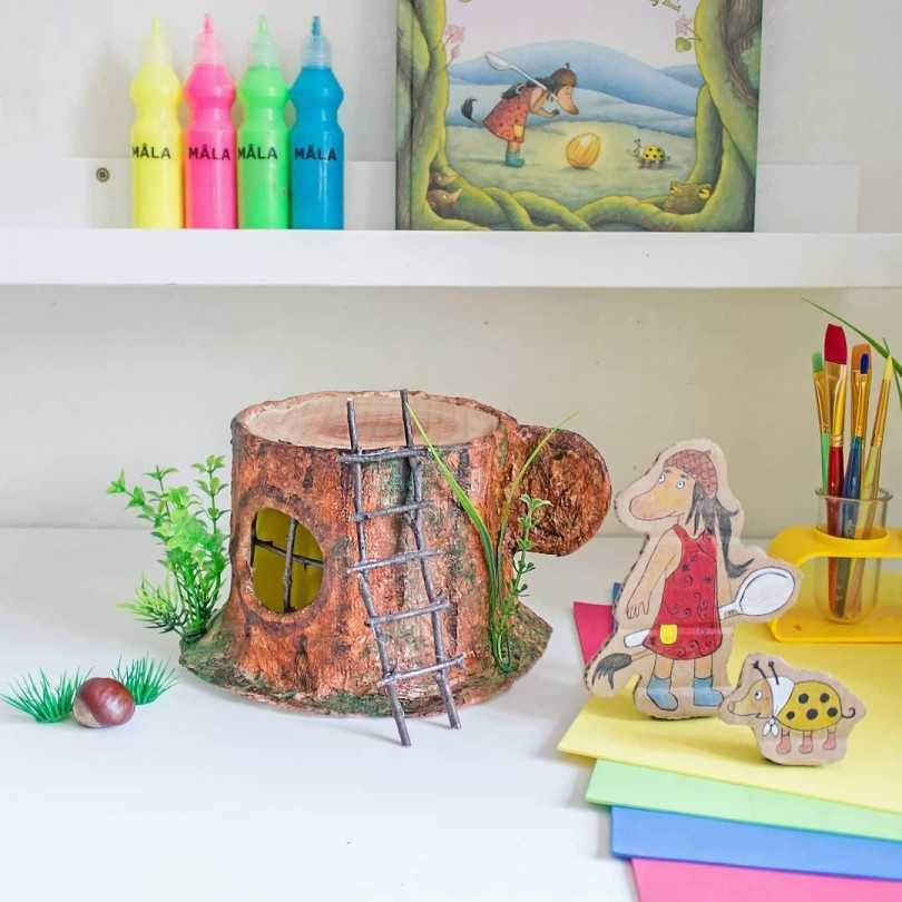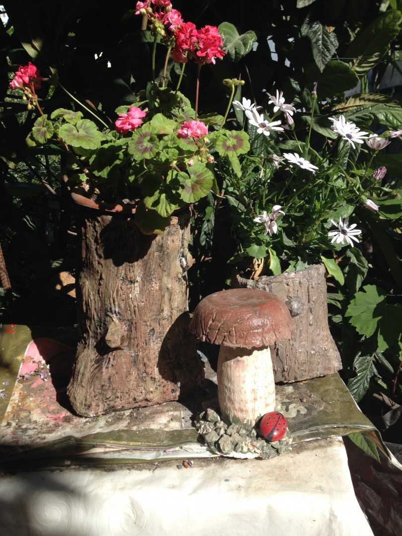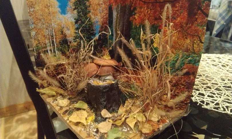 Вам понадобиться: рисунок пня, туалетная бумага, клей ПВА и «Момент», акриловые краски. А декоративные фигурки грибов, насекомых или зверушек можно выполнить из полимерной массы или холодного фарфора.