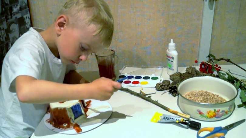 Первым слоем наносим синтетической кистью черную акриловую краску. Желательно, чтобы она проникла во все глубокие прорези. Некоторые места заготовки оставляем не прокрашенными;