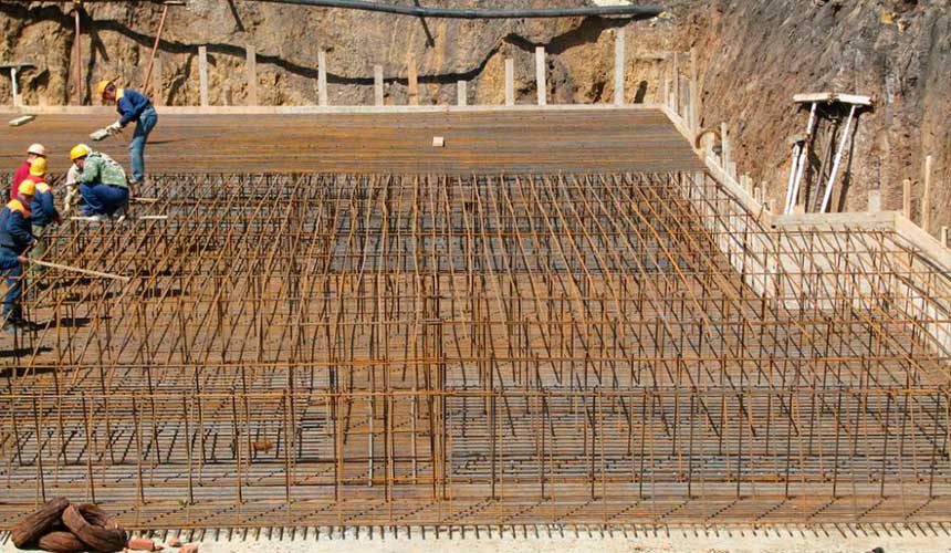 Такой вид фундамента представляет собой мелкозаглубленную в грунт армированную плиту из бетона. Высота основы, в зависимости от вида грунта и массы строения, составляет 0,2–0,4 м. Заливка бетонного раствора выполняется на утрамбованную песчано-щебеночную подушку, сформированную на спланированной площадке. Благодаря применению тяжелого бетонного раствора, а также усилению стальной арматурой, плитный фундамент обладает повышенным запасом прочности.
