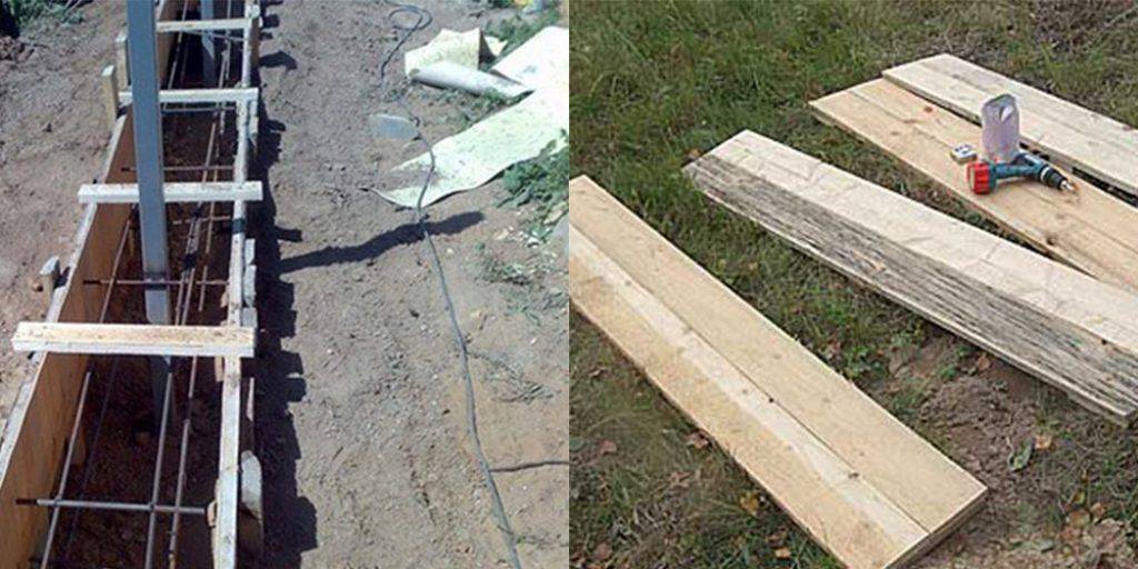 - Опалубка выполняется из досок, их высота может быть примерно пятнадцать сантиметров. Данная процедура необходима, чтобы предотвратить обвал грунта в уже залитый бетон .